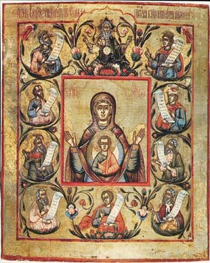 The Kursk Znamenie (Sign) Icon of the Mother of God – is one of the most ancient icons of the Russian Church. In the XIII Century during the time of the Tatar invasion, when all the Russian realm was put to the extremest tribulation, the city of Kursk, ravaged by the Horde of Batu, fell into desolation. One day in the environs of the city an hunter noticed the ancient icon, lying on a root face downwards to the ground. The hunter lifted it and saw that the image of the icon was similar to the Novgorod "Znamenie" Icon. With the appearance of this icon immediately there appeared its first miracle. Just as the hunter lifted up the holy icon from the earth, right then, at that place where the icon lay, gushed up strongly a spring of pure water. This occurred on 8 September 1259. The hunter decided not to leave the icon in the forest and settled on as a resting place an ancient small chapel, in which he put the newly-appeared image of the Mother of God. Soon inhabitants of the city of Ryl'a heard about this, and being in location not far away, they began to visit the place of the appearance for venerating the new holy image.